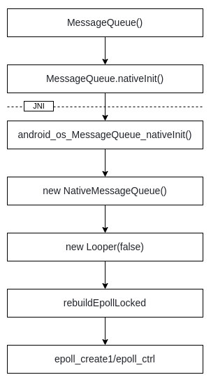 在 Java 层创建 MessageQueue 对象时调用,用于创建 Native 层的 MessageQueue 以及 Looper. 具体调用链如下: